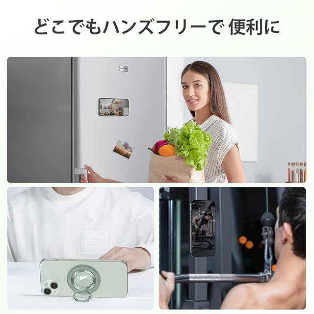 両面磁力デザイン:両面磁力なので冷蔵庫、ジムのマシン、マグネット車載ホルダー等にピタッとくっ付けられ、様々なシーンで大活躍!更に、スマホを安定して支えるため、リングの底部が平らになっています。スマホスタンドとしても安定感が抜群。