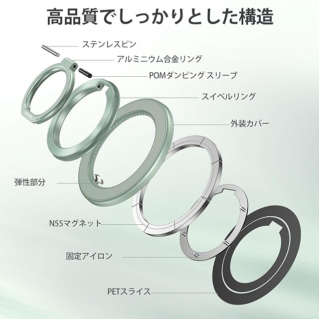 超軽量ながら超强磁力:わずか26.3g、超軽量!たっだ指一本でスマホの落下を防止。業界最強N55磁石で強力な磁吸力を実現し、約1.4KGまでの荷重に耐えます。iPhone16 Pro Maxの重さでも問題なく使用できます。