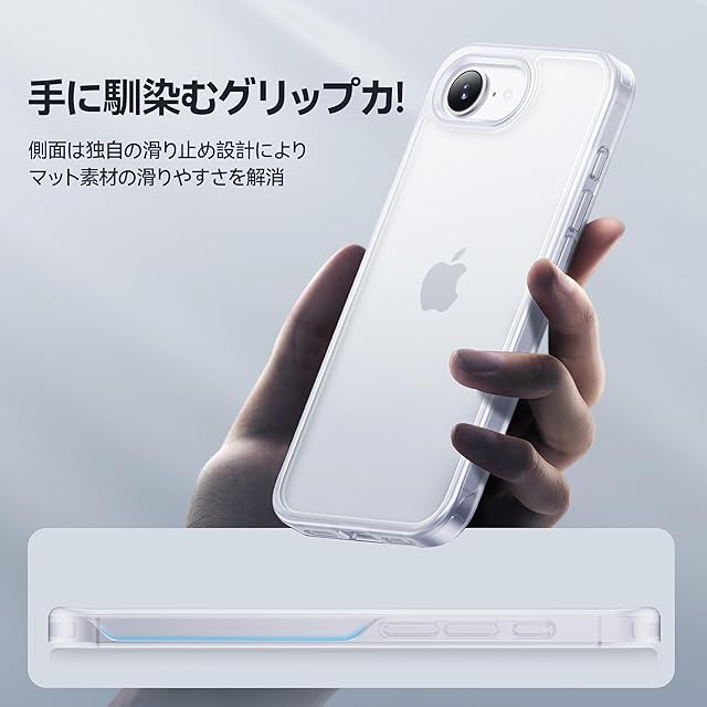 【滑り止め&指紋防止・すごく持ちやすさ】艶消しでマットな質感で手に持った時は背面が滑ることもなくフィットして、サラサラとした触り心地が最高のケース!また、側面の滑り止め設計により、滑りにくさが5倍向上し、持ち心地が従来品より63%改善。手にしっかり馴染み、滑り落ちる心配もない。特許取得済みの撥油塗装で、5年後でもさっぱりした質感を維持し、指紋の付着問題を完全に解消!マットな質感、触り心地、見た目、どれを取っても優勝!対応機種:iphone 16e ケース