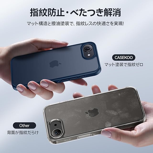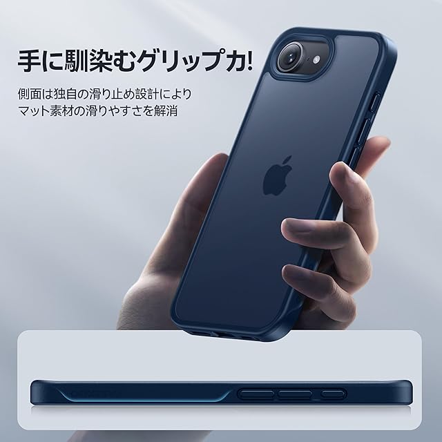 【滑り止め&指紋防止・すごく持ちやすさ】艶消しでマットな質感で手に持った時は背面が滑ることもなくフィットして、サラサラとした触り心地が最高のケース!また、側面の滑り止め設計により、滑りにくさが5倍向上し、持ち心地が従来品より63%改善。手にしっかり馴染み、滑り落ちる心配もない。特許取得済みの撥油塗装で、5年後でもさっぱりした質感を維持し、指紋の付着問題を完全に解消!マットな質感、触り心地、見た目、どれを取っても優勝!対応機種:iphone 16e ケース