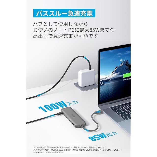 パススルー急速充電:データ転送やHDMI接続などハブとして使用しながらも、お使いのノートPCに最大85Wまでの高出力でパススルー急速充電が可能です。※85Wでのパススルー急速充電を行うためには、100W出力に対応した急速充電器とケーブルをお使いください。なお、急速充電器とケーブルは別売りです。