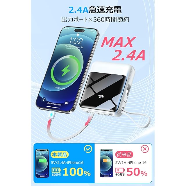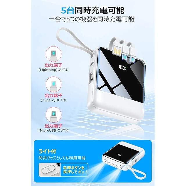 ⚡【4本ケーブル内蔵&5台同時充電可能&5V/2.4A急速充電】最大2.4Aで急速充電可能出力ポートを搭載することで、通常の5W出力に比べ4倍以上の速度で充電することができ、30分で約60%まで充電することができます。出力には3規格出力ケーブルが内蔵された最新型のモバイルバッテリーは、専用ケーブルを持ち歩く必要がなく、各種タイプのデバイスにも対応出来ます。ケーブルを忘れたときも充電ができないなんて心配はいりません。合わせて最大5台の機器を同時に充電することができ、パワーのある究極の携帯充電器です。更に、付属のケーブルは取り外してUSBケーブルとして使用でき、モバイルバッテリー本体と携帯電話の両方を充電することができます。