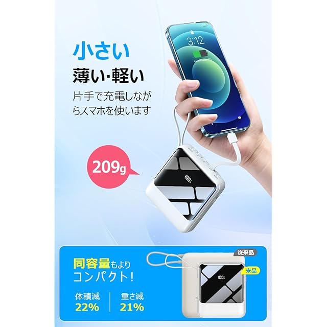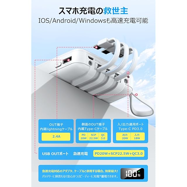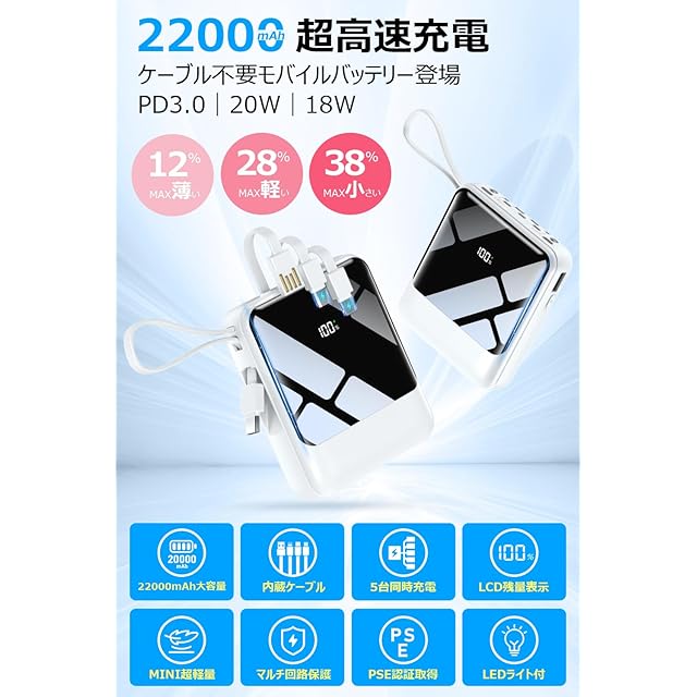 商品名:モバイルバッテリー 超軽量 小型 22000mAh大容量【業界新設計・22.5W/20W急速充電 209g超軽量】モバイルバッテリー 大容量 モバイルバッテリー 軽量 小型 4本ケーブル内蔵 急速充電 携帯充電器 USB-Type C入出力ポート 5台同時充電 LCD残量数字表示 スマホ充電器 コンパクト 持ち運び便利 機内持込可能 LEDライト付き PSE認証済 スマホ 全機種対応 (ホワイト)