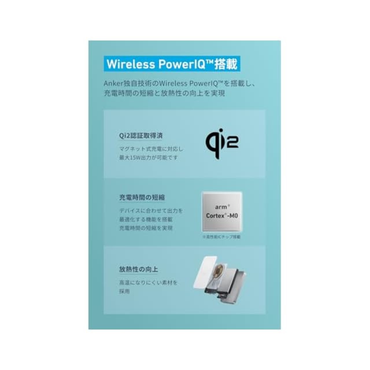 Wireless PowerlQ搭載:Anker独自技術のWireless PowerlQを搭載し、充電時間の短縮と放熱性の向上を実現。