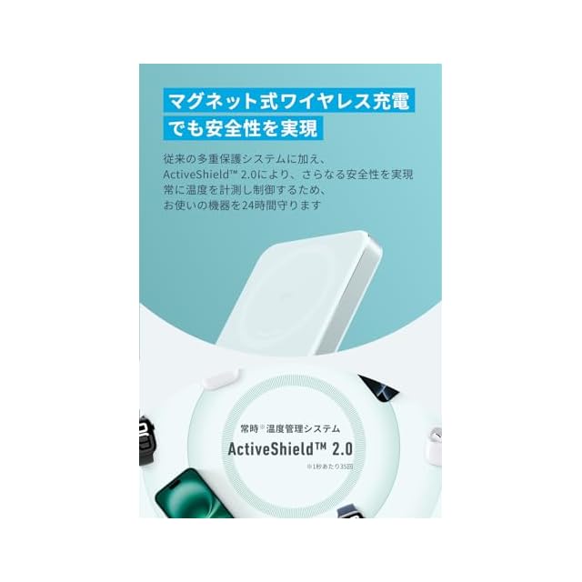 マグネット式ワイヤレス充電でも安全性を実現:従来の多重保護システムに加え、ActiveShield 2.0により、さらなる安全性を実現。常に温度を計測し制御するため、お使いの機器を24時間守ります。