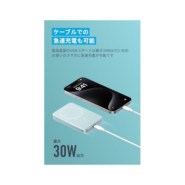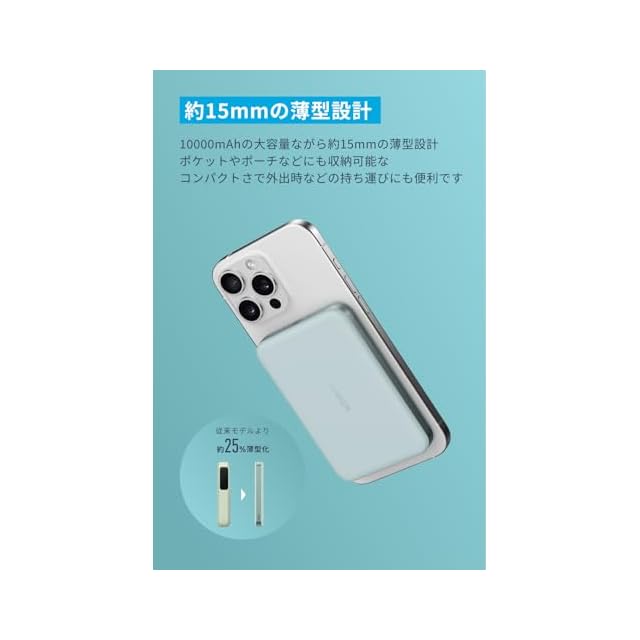 商品名:Anker MagGo Power Bank (10000mAh, Slim) Qi2認証 ワイヤレス充電 最大出力15W MagSafe対応 マグネット式ワイヤレス充電対応 コンパクト 薄型 小型 iPhone 16 / 15 / 14 / 13 / 12 シリーズ専用 (ミントブルー)
