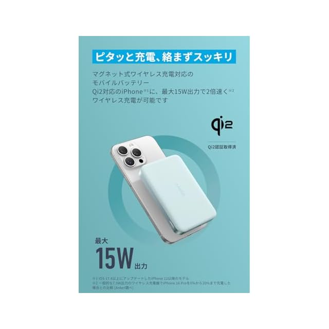 ピタッと充電、絡まずスッキリ:マグネット式ワイヤレス充電対応のモバイルバッテリー。Qi2対応のiPhoneに、最大15W出力で2倍速くワイヤレス充電が可能です。