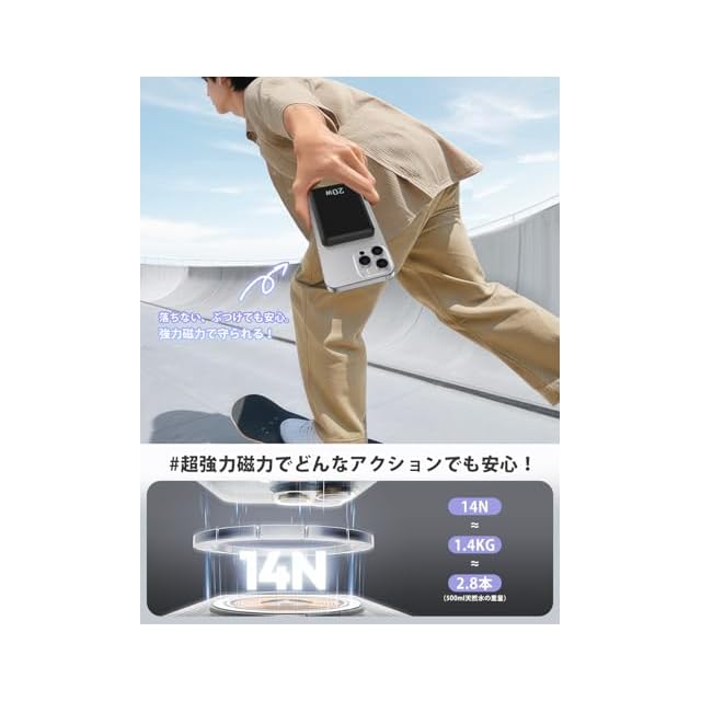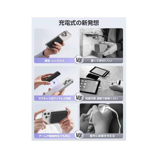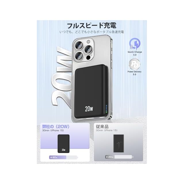 【マグネット式・くっついたまま充電可能】いつも充電ケーブルを持ちのは面倒で悩む方は、今回MagSafe技術応用し、マグネット式ワイヤレスバッテリーを開発しました。強力の磁力を内蔵し、約1200グラムの吸着力がありで、従来のモバイルバッテリーよりは厄介な充電ケーブルの抜き挿し必要なく、デバイスの位置も調整する必要もなく、「ポっ」とスマホに乗せばすぐに充電開始します。弊社の「W5 PRO」はiPhone15に例といえば、30分で約60%を充電可能で、従来品よりは大幅に充電スピードが上がります。その上、iphoneだけではなく、ワイヤレス充電可能の設備はすべて充電できます。「ご注意:Magsafe機能がiPhone12/13/14/15/16全シリーズに適しています(他の機種に対して、Magsafe対応の専用ケース必要があります。」