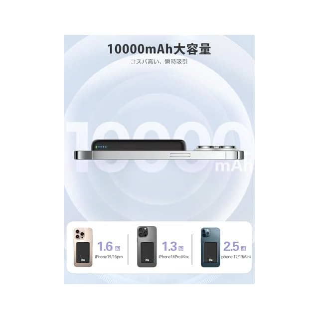 商品名:モバイル バッテリー MagSafe対応 超薄型 軽量 小型 10000mAh PD20W急速充電 三台同時充電 ワイヤレス充電器 マグセーフ充電器 マグネット式 LED残量表示 コンパクト PSE認証済み iPhone 16/15/ 14/ 13/ 12シリーズ 旅行/出張/災害用 機内持ち込み可
