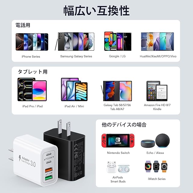 ⚡【ユニバーサル互換性PD充電器】: タイプc アダプタは特別な 4 ポートのため、ほぼすべての電子機器と互換性があります。iPhone 16/15/15 Pro /15 Pro Max/14/14 Pro/14 Pro Max/13/13 Mini/13 Pro Max/12/12 Pro Max/12 Pro Max/12 Mini/SE 2020/11/11 Pro/11 Pro Max/XR/XS/X/8/7、iPad Air/Pro/Mini、Samsung Galaxy、Haiwei、Xiaomi、タブレット、LG、Motorola、Google Pixel などのデジタル機器と互換性のある充電ステーションです。