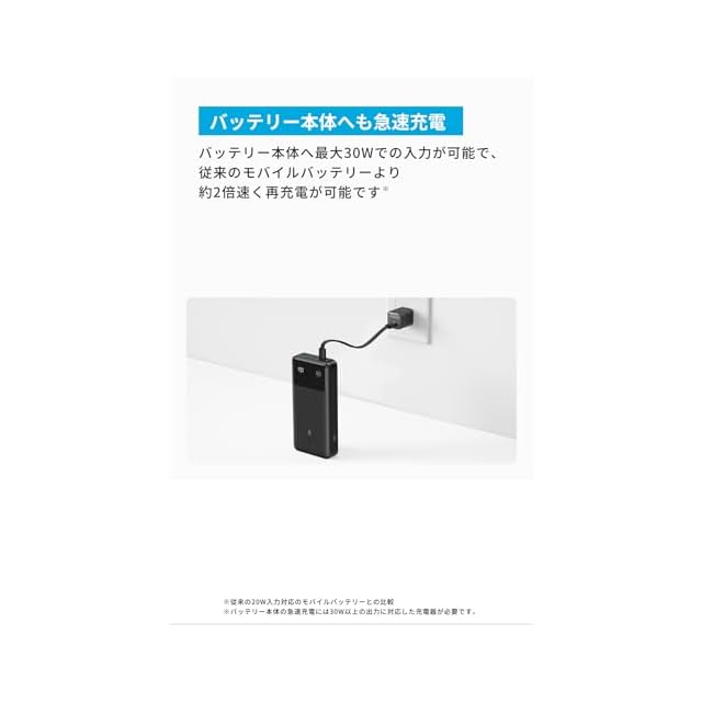 バッテリー本体へも急速充電:バッテリー本体へ最大30Wでの入力が可能で、従来のモバイルバッテリーより約2倍速く再充電が可能です。 (従来の20W入力対応のモバイルバッテリーとの比較)
