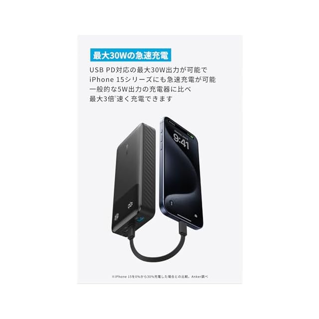 最大30W急速充電:USB PD対応最大30W出力が可能でiPhone 15シリーズにも急速充電が可能です。一般的な5W出力の充電器に比べて最大3倍速く充電できます。※一般的な5W出力の充電器でiPhone 15を0%から30%まで充電した場合との比較(Anker調べ)