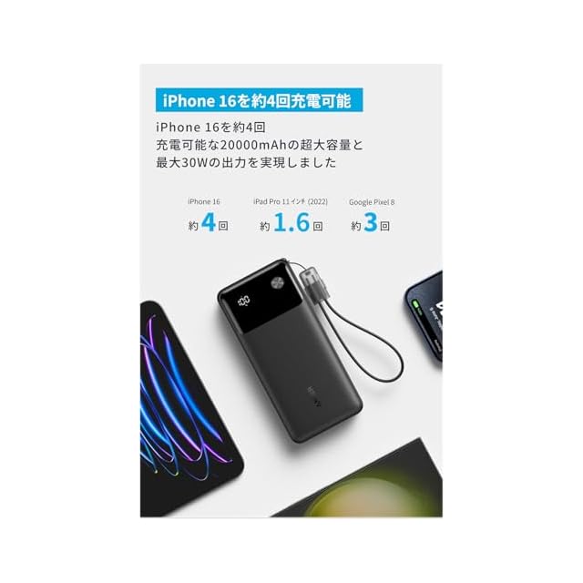 安心の超大容量:20000mAhの超大容量でiPhone 16を約4回、Galaxy S24を3回以上満充電できます。