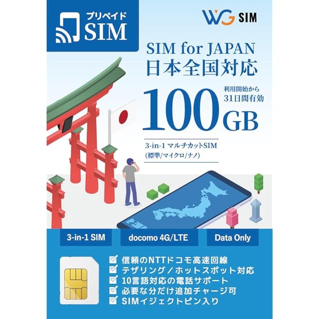 【WG SIMの接続に関するサポートをご希望のお客様は、以下のサポートセンターまでお電話いただけますと幸いです】 ☎050-5835-2190 日本語, English, Chinese, Korean, Portuguese, Spanish(24hours) Thai(JST.10:00a.m – 6:00p.m) Vietnamese, French, Russian, Tagalog(JST.10:00a.m – 7:00p.m) 【同梱物】マルチカットsimカード / SIMピン / 取り扱い説明書 本商品はPLU TO GOのプリペイドSIMです。SIMをデバイスに挿していただき、簡単なAPN設定を行っていただくだけで通信を開始できます。また、多言語マニュアルと日本語を含むカスタマーサポートが提供されているので海外の方でも安心してご利用いただけます。 【カード有効期限について】有効期間は、購入日から10か月後となり、未開通の場合でもご購入から10か月以内に使用を開始する必要があります。使用を開始すれば、最大180日間利用可能です。このSIMカードは、4Gの高速データ通信が可能で、10GBのデータ通信が提供されます。Docomoの強力な電波エリアで利用できるため、快適に使用できます。 【対応端末】SIMロック解除された端末やSIMフリー端末で使用できます。テザリング機能がある端末であれば、データ通信を分け合い、高速通信を共有することが可能です。 対応する周波数帯は以下の通りです: 【4G】Band1 (2,100MHz)、Band3 (1,800MHz)、Band8 (900MHz)、Band28 (700MHz) 【3G】2,100MHz、900MHz ご利用の機種によっては、対応しない場合がありますので、事前にご確認ください。iOS端末を使用する場合、他の格安SIMの設定が残っていると通信が競合し、接続できないことがあります。その場合、APNプロファイルの削除が必要です。 【SIMカードサイズとサポート】 このSIMカードは3-in-1サイズに対応しており、切り取り線に従って、使用するサイズに合わせて簡単に分割できます。 さらに、日本語対応のカスタマーサポートがあり、24時間365日、日本語・英語・中国語でのサポートを提供しています。日本への一時帰国やテレワーク、訪日外国人にも安心して利用いただけます。 【アプリ通話対応】電話番号での通話はできませんが、LINEやSkypeなどのアプリを使って音声通話が可能です。