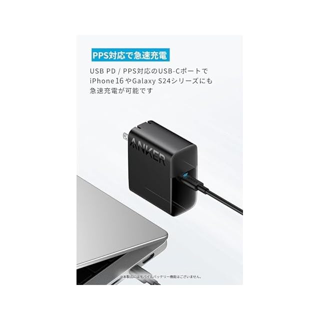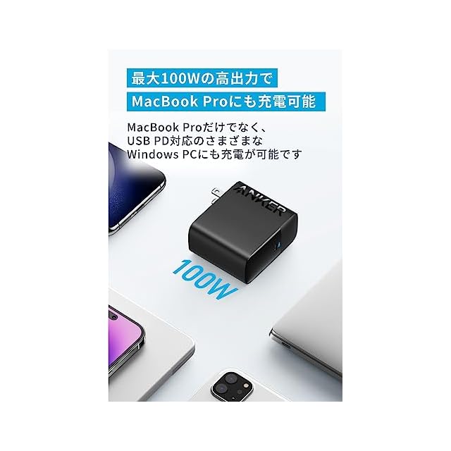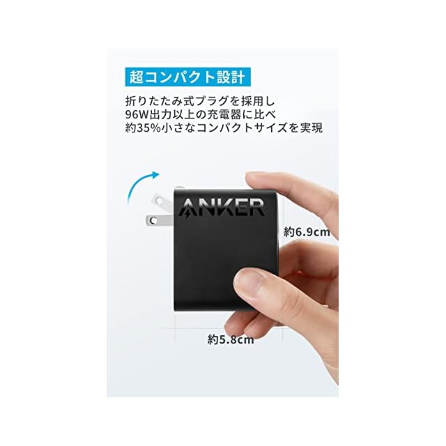 コンパクト設計: 一般的な充電器と比べコンパクトなデザインを実現。96W出力以上の充電器に比べ約35%小さなコンパクトサイズを実現。折りたたみ式プラグを採用し、どこにでも気軽に持ち運ぶことができます。(※Anker調べ)。