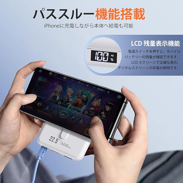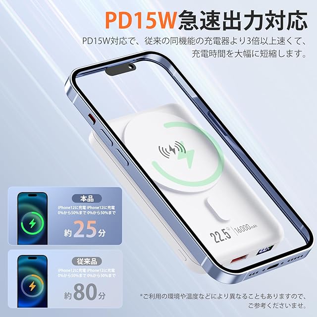 【注意事項】①Magsafe充電はiPhone12~16のみに対応しています。それ以外の機種は、充電ケーブルを使用して充電してください。②複数のデバイスを同時に充電したり、充電しながらスマートフォンを使用したりすると、電力の一部が失われるのは正常な動作です。③モバイルバッテリーに付属の充電ケーブルは、本体の充電にのみ使用できます。出力機能はないため、スマートフォンの充電には使用できません。④モバイルバッテリーはバッテリーを内蔵した電子製品です。衝撃を与えたり、強く押し付けたりしないでください。衝撃を与えると破損する恐れがあります。使用しない時は安全な場所に保管してください。⑤充電中にモバイルバッテリーが熱くなるのは正常な動作です。高温の場所で使用すると、さらに熱くなる可能性があります。⑥モバイルバッテリーは、Magsafe非対応のケースには対応していません。MagSafe対応のケースをお使いください。⑦バッテリーを充電するには、製品に付属の充電ケーブルを使用する必要があります。⑧このモバイルバッテリーはAndroidの充電にも対応しています。携帯がワイヤレス充電に対応している場合は、ワイヤレス充電または充電ケーブルでの充電が可能です。携帯がワイヤレス充電に対応していない場合は、充電ケーブルのみで充電できます。