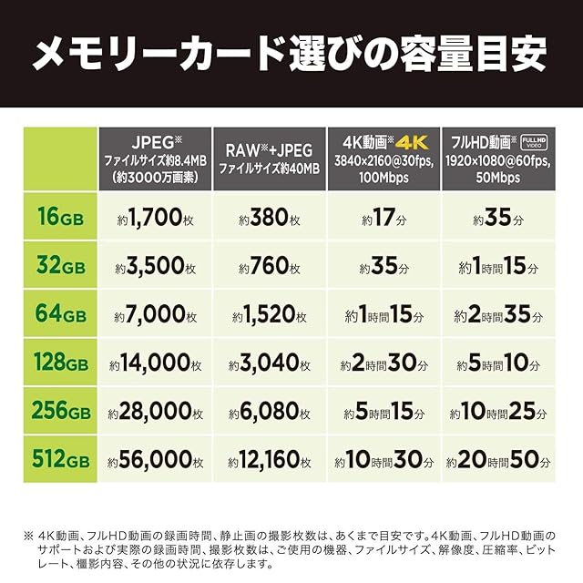 "中断なく長時間撮影:最大512GB1の大容量で、カードの交換やデータのオフロードをすることなく、60 fpsで撮影した4K UHDビデオ3を最大352分、30 fpsで撮影した8Kビデオ3を最大286分保存できます。5 3 4K UHD(3840x2160)および8K(7680x4320)ビデオのサポートについては、ご使用の機器、ファイルサイズ、解像度、圧縮率、ビットレート、撮影内容、その他の状況に依存します。 5 使用の目安:実際の数値は、ファイルのサイズ、解像度、圧縮、ビットレート、コンテンツ、ホスト機器、あらかじめ読み込まれているファイル数、その他の要素により異なります。"