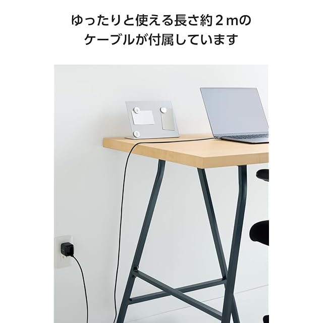 足下のコンセントに接続してもゆったり使用できる長さ2mのUSB Type-C(TM) - USB Type-Cケーブルが付属しています。ケーブルは着脱式なので、すっきりまとめて持ち運びが可能です。