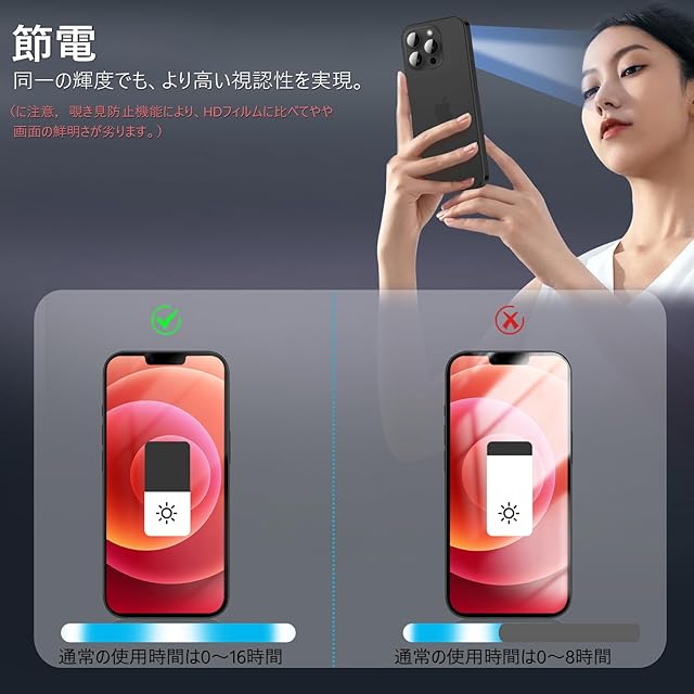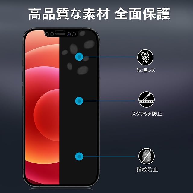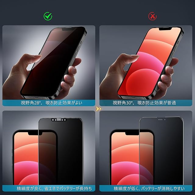 【360度覗き見防止,プライバシーフィルム】 iPhone12Proの360度覗き見防止フィルム,上下左右4方向の360度(前から约28度の視視角)のぞき見防止。正面から見る時はっきり見える、高透過率があり,側方から見るときにはブラインドを通して画面が徐々に暗くなる。画面の表示内容や個人情報は完璧に保たれ、周りからののぞきを心配せずにLINEやメールを交換できます。