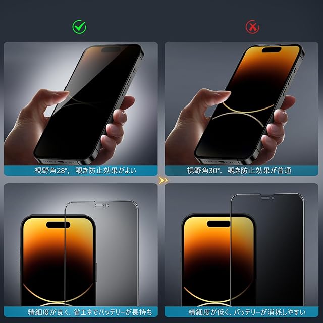 【360度覗き見防止,プライバシーフィルム】 iPhone14Proの360度覗き見防止フィルム,上下左右4方向の360度(前から约28度の視視角)のぞき見防止。正面から見る時はっきり見える、高透過率があり,側方から見るときにはブラインドを通して画面が徐々に暗くなる。画面の表示内容や個人情報は完璧に保たれ、周りからののぞきを心配せずにLINEやメールを交換できます。