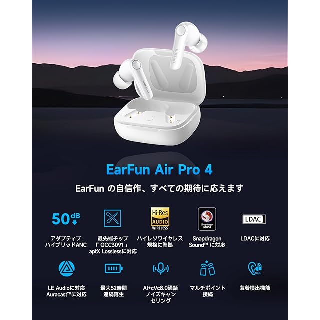 商品名:【VGP 2025 金賞】EarFun Air Pro 4 ワイヤレスイヤホン Bluetooth 5.4/50dBアダプティブ式 ハイブリッドANC/最先端チップ「QCC3091」aptX Losslessに対応/ハイレゾ LDAC対応/Snapdragon Sound™ に対応/Auracast™に対応/52時間連続再生【6マイクAI 通話/PSE認証済み】 装着検出機能 (光沢ホワイト)