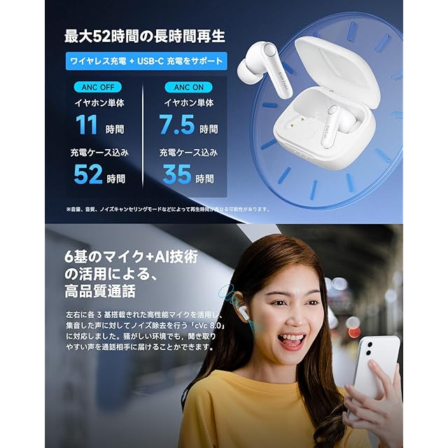 【最大52時間の長時間再生/IPX5 防水性能】Qualcommの最新 S3 第 3 世代高性能 QCC3091 Bluetooth チップの極めて低い消費電力に基づいて、Air Pro 4はフル充電で 11 時間使用でき、充電ボックス込みで最大 52 時間使用できます。ワイヤレス充電とUSB-C充電の2つの充電方法に対応しており。急速充電にも対応しており、10分の充電で2時間使用可能。イヤホンはIPX5の防水性能を備えており、不意の水濡れや運動中の発汗などにも安心して対応できます。ご注意:充電ボックスは防水ではないため、充電ボックスを乾燥した状態に保ってください。