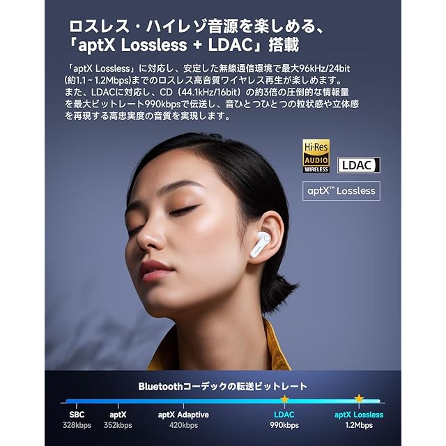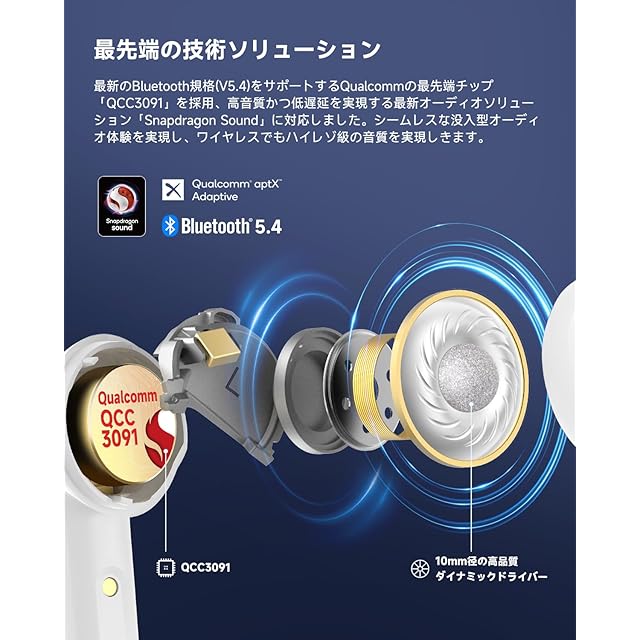 ⭐これまでのホワイトとの違いは、以前のホワイトは側面がシルバー仕上げでしたが、今回の新色はイヤホン全体が美しい白で統一されています。【先進の技術ソリューション& aptX Losslessロスレス音声伝送】EarFun Air Pro 4は、2024年・2025年と2年連続で『VGP金賞』を受賞、さらに2025年『コスパ大賞』を獲得しました。クアルコムの最先端チップ『QCC3091』を搭載し、最新Bluetooth規格(v5.4)とオーディオソリューション『Snapdragon Sound』に対応。高音質と超低遅延を両立しています。「aptX Lossless」に対応し、安定した無線通信環境で最大96kHz/24bit(約1.1~1.2Mbps)の高音質な音楽ワイヤレス再生が楽しめます。 また、LDACに対応し、CD(44.1kHz/16bit)の約3倍の圧倒的な情報量を最大990kbpsのビットレートで伝送し、音楽の細部を保存し、真のオリジナルサウンドを聞くことができます。