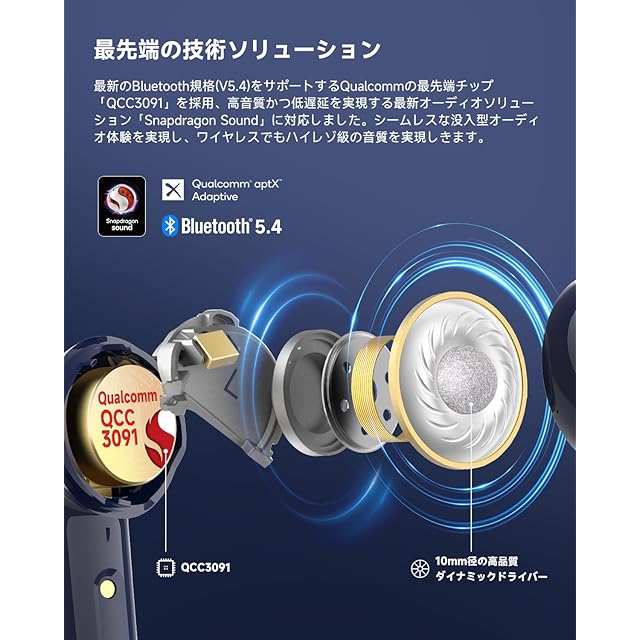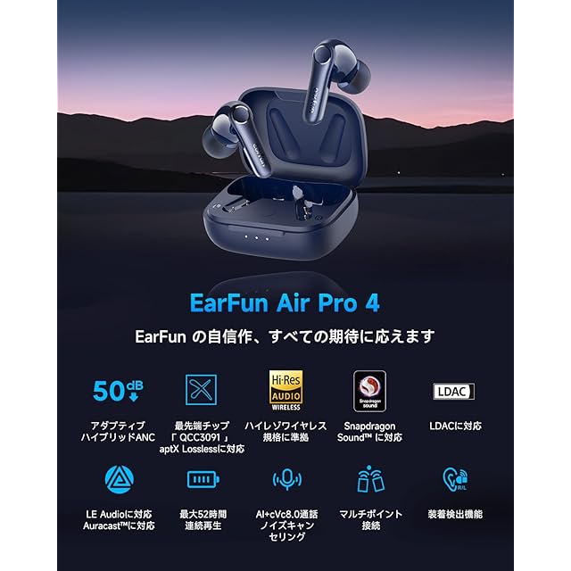 商品名:【VGP 2025 金賞】EarFun Air Pro 4 ワイヤレスイヤホン Bluetooth 5.4/50dBアダプティブ式 ハイブリッドANC/最先端チップ「QCC3091」aptX Losslessに対応/ハイレゾ LDAC対応/Snapdragon Sound™ に対応/Auracast™に対応/52時間連続再生【6マイクAI 通話/PSE認証済み】 装着検出機能 (ネイビー)