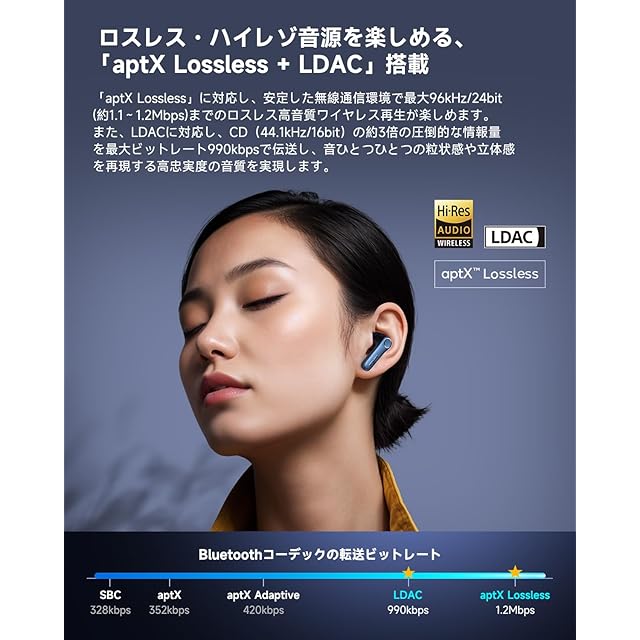 【先進の技術ソリューション& aptX Losslessロスレス音声伝送】EarFun Air Pro 4は、Qualcommの最先端チップ「QCC3091」を採用。最新のBluetooth規格(V5.4)と 最新のオーディオソリューション「Snapdragon Sound」に対応し、高音質と低遅延を実現します。「aptX Lossless」に対応し、安定した無線通信環境で最大96kHz/24bit(約1.1~1.2Mbps)の高音質な音楽ワイヤレス再生が楽しめます。 また、LDACに対応し、CD(44.1kHz/16bit)の約3倍の圧倒的な情報量を最大990kbpsのビットレートで伝送し、音楽の細部を保存し、真のオリジナルサウンドを聞くことができます。