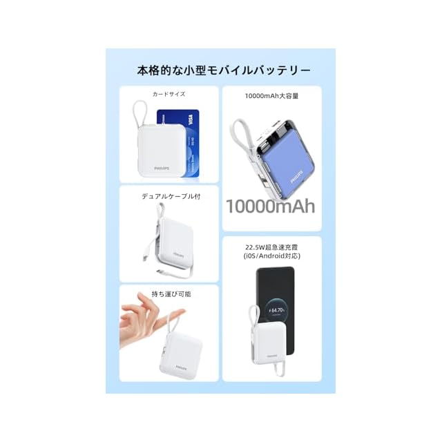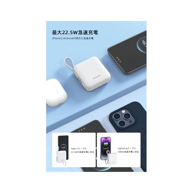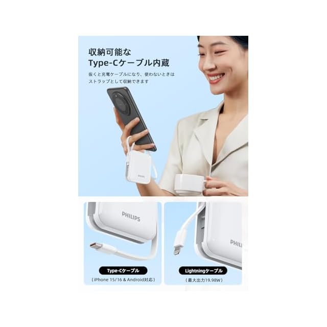 商品名:Philips (フィリップス) モバイルバッテリー 10000mAh 大容量 小型 携帯充電器 Lightning type-c ケーブル内蔵 22.5W タイプc ライトニング 4台同時充電 スマホ 持ち運び iPhone 16 / 15 Android iPad 各種機器対応 PSE認証済 ホワイト DLP5713CW
