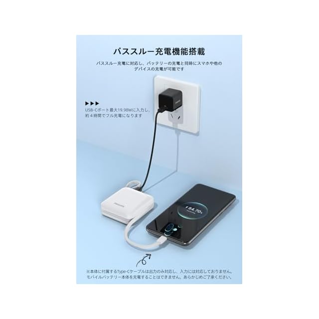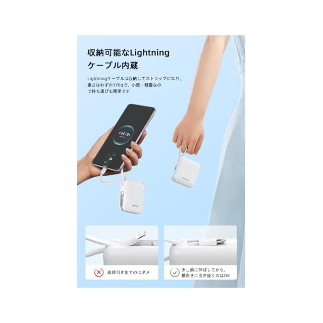 【収納可能なケーブル&22.5W急速充電】 収納可能なライトニングケーブルとタイプcケーブルを内蔵しており、デバイスを充電するときはケーブルを抜き、充電しないときは収納しておくことができます。Type-CケーブルはiPhone 15 / 16シリーズを、LightningケーブルはiPhone 14 / 13 / 12以下を充電します。usb-cケーブルは22.5Wの高速出力、ライトニングケーブルも約19.98Wの高速出力に対応し、iPhoneとAndroidデバイスの両方に急速充電が可能です。※本体に付属するType-Cケーブルは出力のみ対応し、入力には対応しておりません。モバイルバッテリー本体を充電することはできません。あらかじめご了承ください。