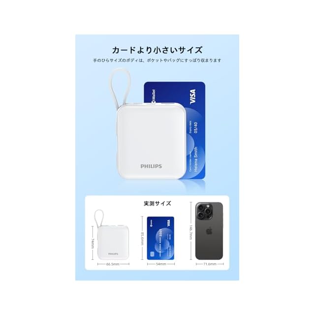 【カードサイズで携帯便利】 PHILIPS 超小型モバイルバッテリー新登場!6.65cmx2.55cmx7.4cmのミニボディ、手のひらサイズでポケットやカバンにもすっぽり収まります。 重さはわずか176gで、手に持っても負担になりません。歩きながら充電する必要がある方には、間違いなくおすすめのアイテムです。