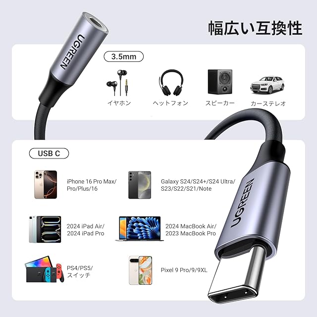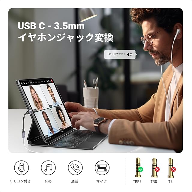 【多機能・多用途を持つ一品!】UGREENこのUSB C イヤホンジャックはインラインコントロールに対応により、音楽の再生・停止やボリューム操作ができてとても便利。マイク付きのイヤホンを使えば通話もできます。オーディオとマイクの両方の機能に対応しており、ゲーム、ナビゲーションにも便利になり、TRRSの3.5mmマイクでの使用にも特徴。プラグ&プレイ、挿すだけで操作でき、使い勝手が向上。