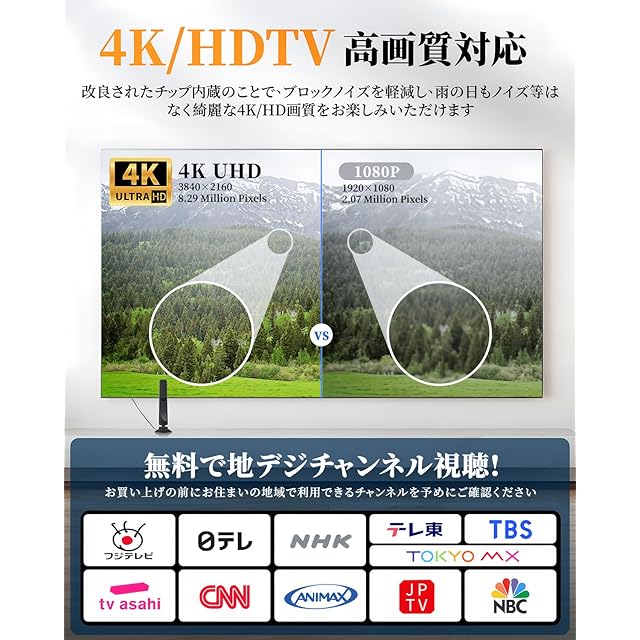 【4K HDTV画質無料視聴】最大450kmの受信距離を実現した高性能なHD屋外・屋内用アンテナです。フル4K1080pHDをデジタル対応のテレビに配信します。改良された4Kアンテナ画質が80%改善され、クリアな画質と鮮やかな色が楽しめますでき、ノイズは低くなっています。