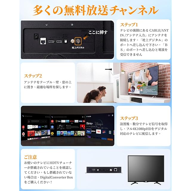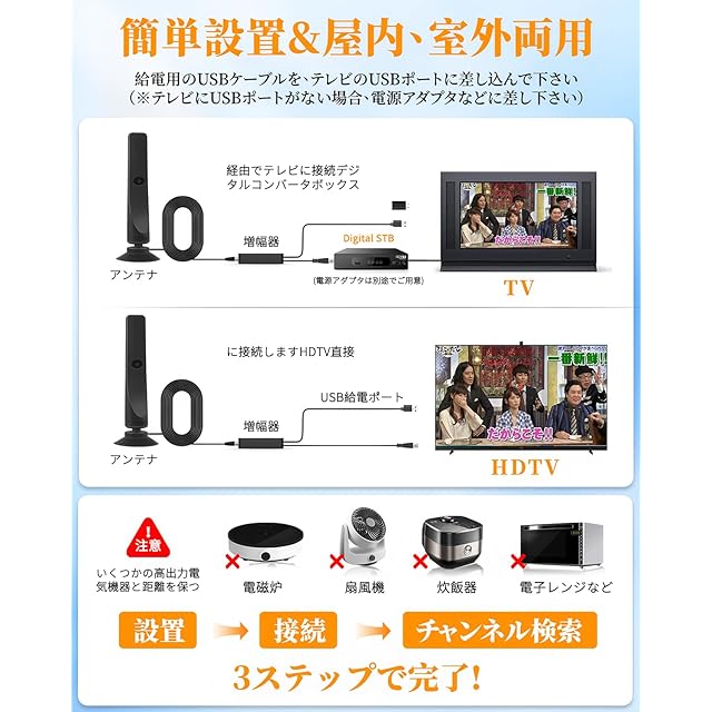 【360全方位受信】360全方位からの電波を受信することができます。私たちのスマートアンテナは独自に開発した適応強化信号増幅器を採用しており、スマートICチップを内蔵しています。過電圧保護機能が組み込まれたSmart IC USB電源アダプタは、DTVアンテナを電源に接続するためのUSB出力がテレビにない場合に役立ちます。