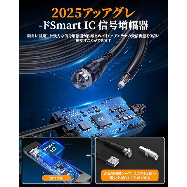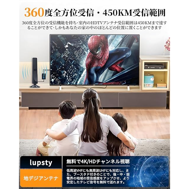 商品名:【2025新改良】テレビアンテナ Lupsty 室内アンテナ 地デジアンテナ ブースター 増幅器 360度全方位受信 450KM受信範囲 無料視聴 防水 4K HDTV 高感度 USB式簡単接続 小型 コンパクト UHF VHF対応 強電界 屋外・屋内用