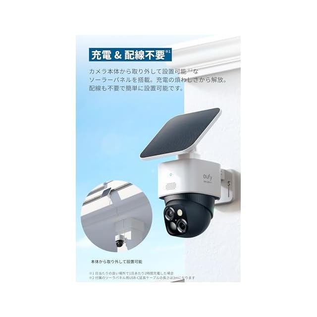 充電 & 配線不要:カメラ本体から取り外して設置可能なソーラーパネルを搭載することで、充電の煩わしさから解放。配線も不要で簡単に設置可能です。