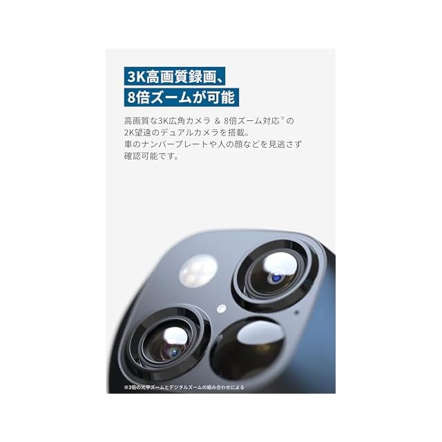 3K高画質録画、8倍ズームが可能:高画質な3K広角カメラ&8倍ズーム対応の2K望遠のデュアルカメラを搭載。車のナンバープレートや人の顔などを見逃さず確認することが可能です。