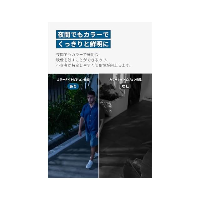 夜間でもカラーでくっきりと鮮明に:夜間でもカラーで鮮明な映像を残すことができるので、不審者が特定しやすく防犯性が向上します。さらにAIモーショントラッキングにより、人物やペットを自動で追尾してはっきりと撮影できます。