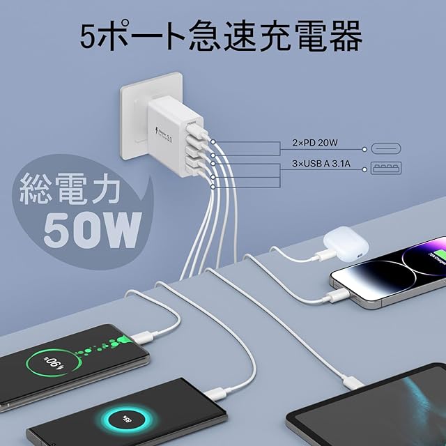 商品名:[2個パック] USB C充電器 50W、【2つのUSB-Cと3つのUSB-A】を備えた5ポートマルチType-Aプラグ、総電力50WUSB電源アダプタ壁コンセント、急速充電PD 3.0電源アダプタ iPhone 11/12/13/14/15/16/XS/XR/SE/8 Plus/サムスン/携帯電話/タブレット対応