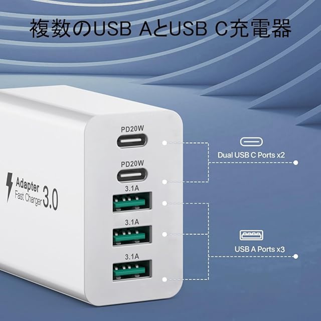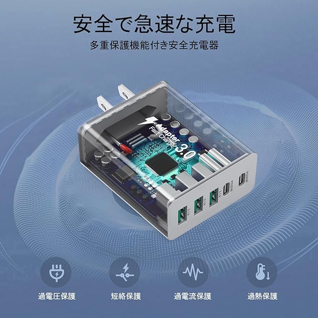 複数ポート付きUSB壁掛け充電器 - 複数のデバイスを同時に充電でき、USB Cは急速充電に対応。 <br>PD 3.0急速充電技術搭載のUSB-C充電器は、わずか30分で携帯電話を15~60%充電できます。古くて遅い充電器を置き去りにして、簡単な生活を楽しみましょう。 <br>急速充電はスマート電力分配をサポートし、5台のデバイスを接続すると、ポート間で効率的に電力が分配され、最適な充電電流が確保されます。5ポート充電器は、複数のデバイスを充電するニーズを迅速かつ効率的に解決します。 <br>スマートデザイン:2つのUSB-Cポートと3つのUSB-Aポートが1つの充電器に搭載されています。 <br>USB-CとUSB-Aは、異なるポートを持つ充電器の乱雑さからあなたを解放します。