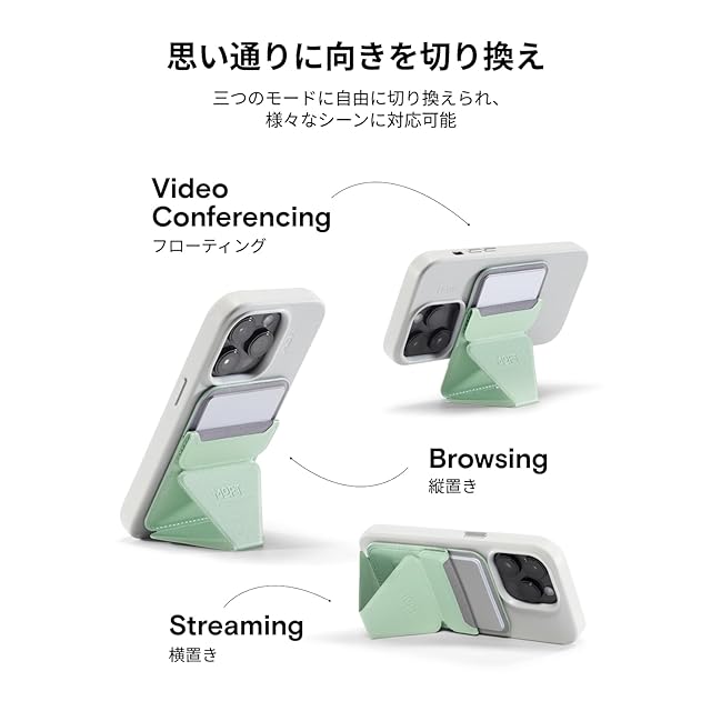 【三つの使用モード・自由に切り換え】マグネット内蔵で、MagSafe対応機種(iPhone16/15/14/13/12シリーズ)にお使いいただけます。縦置き、横置き、フローティングモードに自由に切り換えられ、様々なシーンに対応可能です。