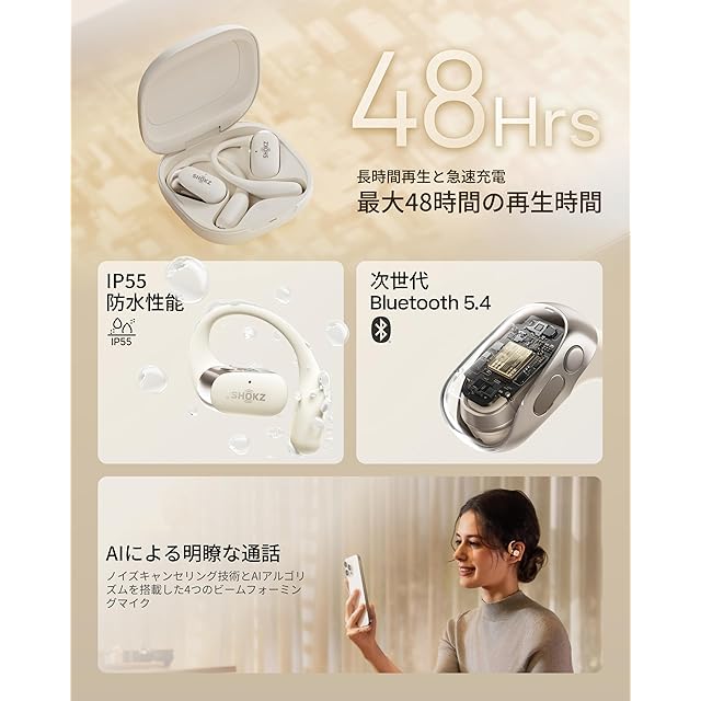 商品名:Shokz (ショックス) OpenFit 2 オープンイヤーヘッドホン 完全ワイヤレスイヤホン Bluetooth5.4 耳を塞がない 空気伝導 自動ペアリング マイク付き 充電ケース付き 左右分離型 9.4g超軽量 合計48時間再生 スポーツイヤホン IP55防水性能 急速充電 ハンズフリー通話 2025年新登場 ベージュ