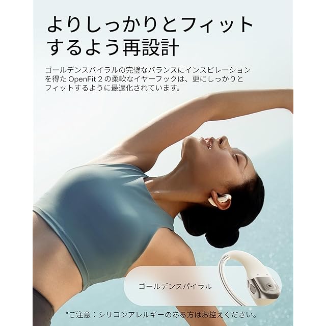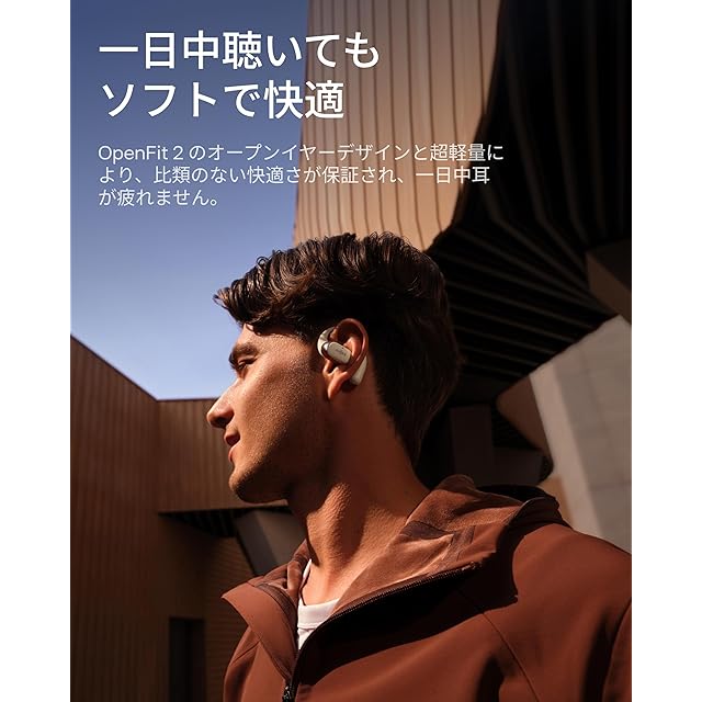 オープンイヤー型の快適さ:耳を塞がないオープンイヤーデザインで、長時間の使用でも聞き疲れや蒸れを感じません。片耳9.4gという軽さで、Shokz Ultra-Soft Silicone 2.0を採用したOpenFit 2は、肌に優しく、自然なフィット感で快適に装着できます。
