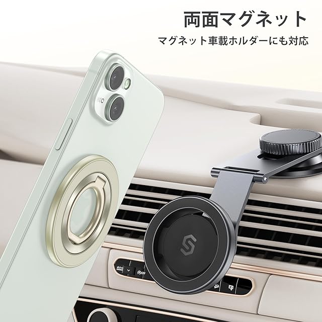 両面磁力デザイン:両面磁力(耐荷重量最大5KG)なので冷蔵庫、ジムのマシン、マグネット車載ホルダー等にピタッとくっ付けられ、様々なシーンで大活躍!更に、スマホを安定して支えるため、リングの底部が平らになっています。スマホスタンドとしても安定感が抜群。