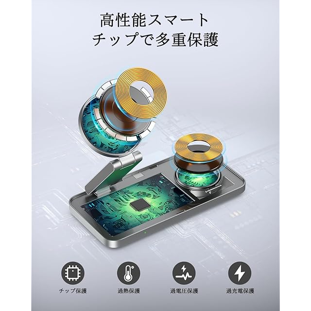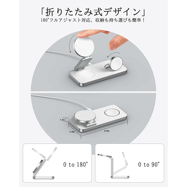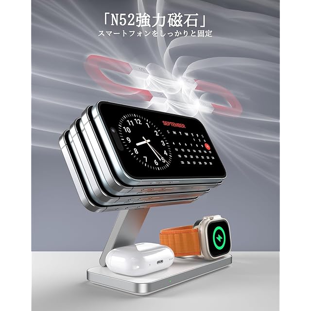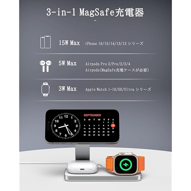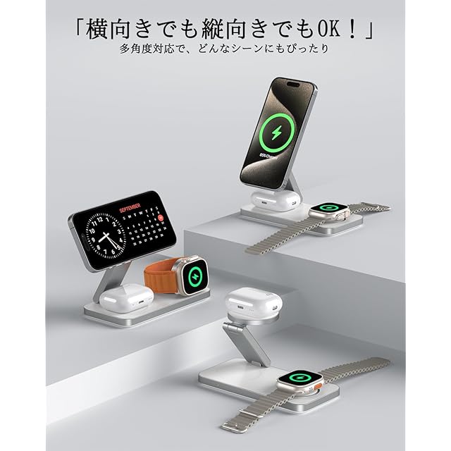 【幅広い互換性】:iPhone 16、iPhone15、iPhone14、iPhone13、iPhone12シリーズ.、他にもQi規格に準拠したデバイスであれば充電可能です。Airpods:AirPods(第2世代)、AirPods(第3世代)、AirPods Pro Apple Watch:Apple Watch ultra/ Series 10/9/8/7/6/5/4/3/2、Apple Watch SE(第1世代・第2世代)、Apple Watch Ultra