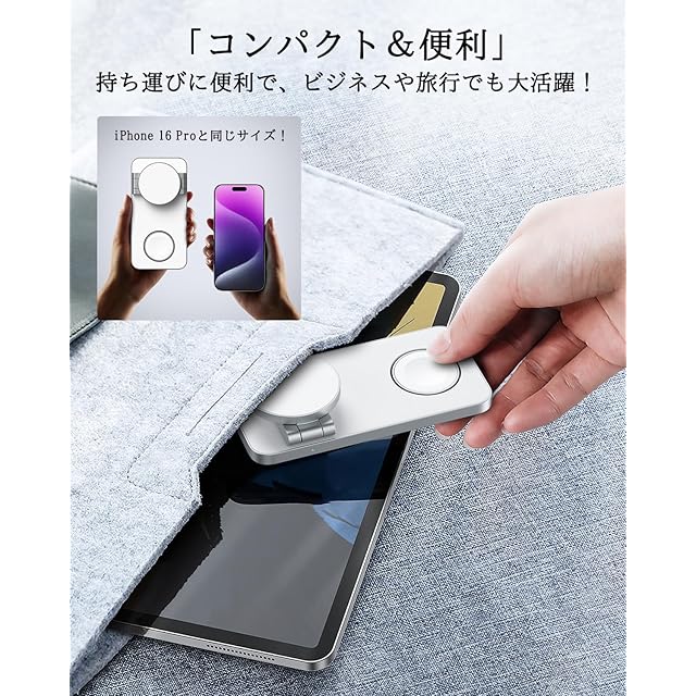 【超コンパクト・折り畳み式】この3in1折りたたみ式マグセーフ充電器は、折りたたんだ状態で長さ15cm、幅7.5cm、厚さ3cmと非常にコンパクトなサイズです。iPhone 16 Proとほぼ同じ大きさで、手のひらやポケットに簡単に収まります。どこへ行くにも便利に持ち運ぶことができ、出張や旅行には必須のアイテムです。