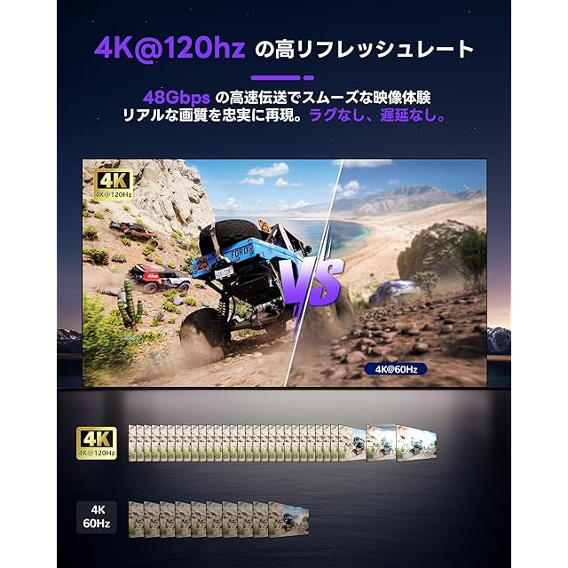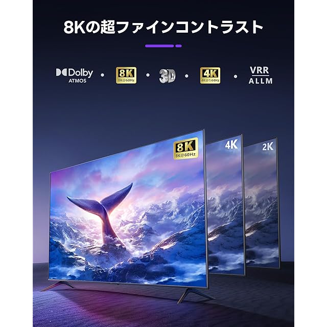 【8K UHD解像度対応】8K@60Hz、4K@120Hz/144Hz/60Hz、1080P@240Hz/120Hzに対応。HDR10、Dolby Vision、HDR10+、RGB 4:4:4、VRR、ALLMをサポートし、鮮明でスムーズな映像を楽しめる。