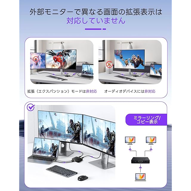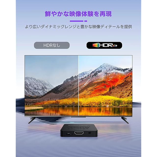avedio linksのHDMI分配器は、1つのHDMI入力を2つのディスプレイに同時出力できる高性能モデルです。8K@60Hz、4K@120Hz/144Hz/60Hz、1080P@240Hz/120Hzの高解像度に対応し、HDR10、Dolby Vision、VRR、ALLMなどの最新技術をサポート。鮮明な映像と低遅延で、ゲームや映画鑑賞、プレゼンテーションなどに最適です。 本製品はEDID管理機能を搭載し、使用環境に応じた適切な解像度を自動または手動で選択可能。幅広いHDMI機器に対応し、パソコン、ゲーム機、ストリーミングデバイスなどと組み合わせて使用できます。 設置は簡単で、付属の1.2m 8K HDMIケーブルと電源アダプターを接続するだけで使用可能。安定した動作のために、必ず付属の電源アダプターを使用してください。 ※本製品は拡張モードには対応しておらず、2つの画面には同じ映像が出力されます。また、HDMIスイッチ機能やオーディオ分離機能、ARC/eARCには対応していません。