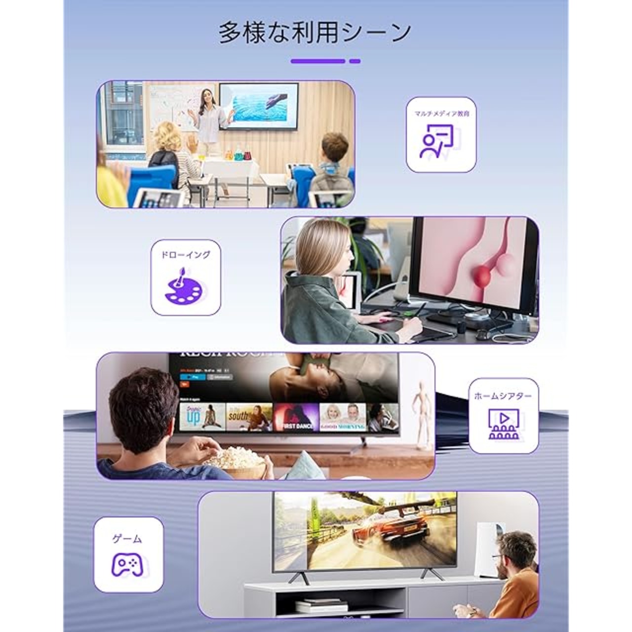 【幅広い互換性】パソコン、Chromecast、ゲーム機(NS/PS5/PS4/Xbox)、Fire Stick、Blu-rayプレーヤー、衛星放送レシーバー、Rokuなどに対応。出力先としてテレビ、モニター、プロジェクター、VRヘッドセットなど幅広く使用可能。